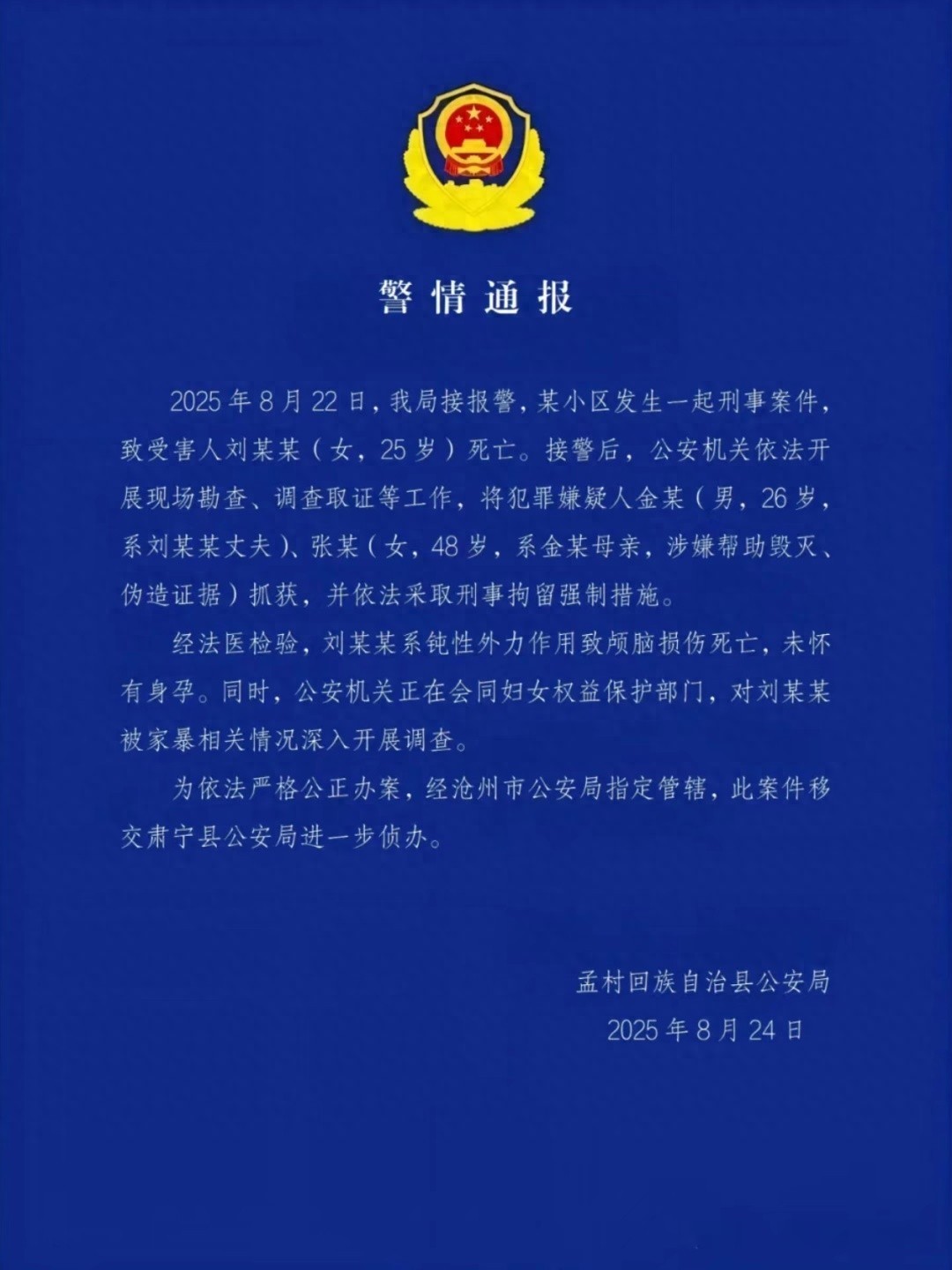 记者从沧州市中级人民法院获悉,2025年12月9日,沧州市中级人民法院一审公开宣判,判处被告人金昊死刑,剥夺政治权利终身;判处被告人张杰(金昊母亲,帮助毁灭证据罪)有期徒刑2年2个月。此前报道8月22日在线配资炒股,一则关于河北沧州孟村县女子刘某某疑遭丈夫金某家暴致死的消息在当地流传在线配资炒股,并迅速引发关注。8月24日23时27分,当地公安局发布警情通报称,已将犯罪嫌疑人金某、张某抓获。通报指出,2025年8月22日,孟村县公安局接报警,某小区发生一起刑事案件,致受害者刘某某(女,25岁)死亡。接警后,公安机关依法开展现场勘查、调查取证等工作,将犯罪嫌疑人金某(男,26岁,系刘某某丈夫)、张某(女,48岁,系金某母亲,涉嫌帮助毁灭、伪造证据)抓获,并依法采取刑事拘留强制措施。通报进一步披露,经法医检验,刘某某系钝性外力作用致颅脑损伤死亡,未怀有身孕。为依法严格公正办案,经沧州市公安局指定管辖,此案件移交肃宁县公安局进一步侦办。